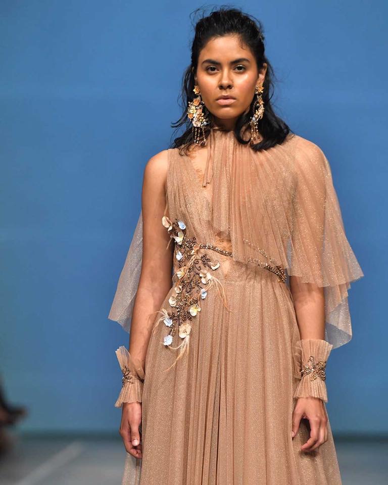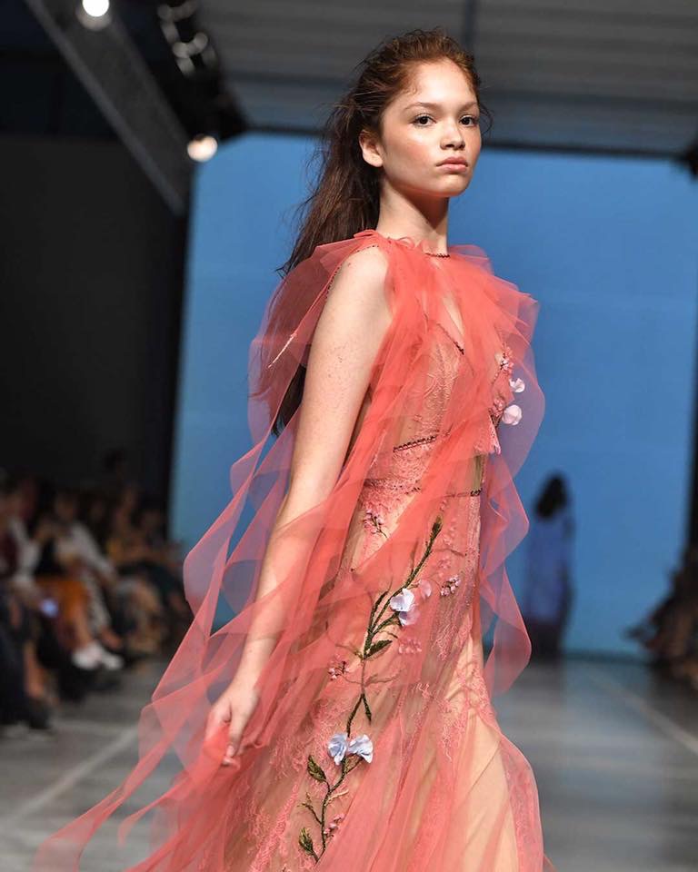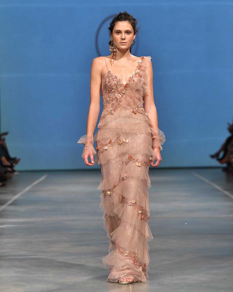 “Floral Sculpture” llena de románticos diseños que evocan a la naturaleza y a la belleza de las flores. La colección tuvo una predominancia del Tul, el cual en cada uno de los atuendos generaba con el movimiento, un desplazamiento etéreo y delicado. La propuesta partió de tonos blancos y grises a tonos coral y rosa pálidos. Además de mostrar gran maestría de bordado y calidad de trabajo artesanal.